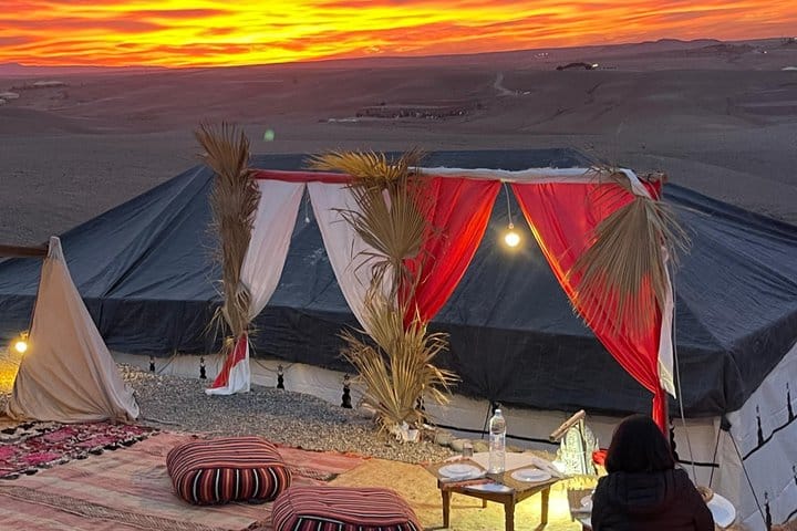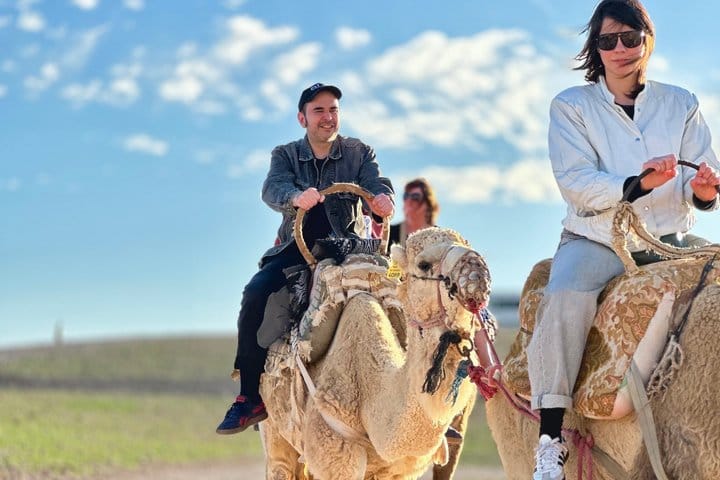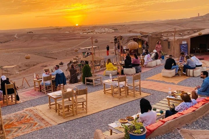 Savor the magic of the Agafay Desert with an unforgettable evening that includes a scenic camel ride and a delicious dinner under the stars. As the sun sets over the Atlas Mountains, ride across the rocky dunes on a dromedary, followed by a traditional Moroccan dinner featuring flavorful tagine and tea. Enjoy live Berber music and a captivating fire show, creating a vibrant atmosphere to end your day. This tour is perfect for families, couples, or anyone seeking an authentic Moroccan experience while enjoying the desert’s beauty.