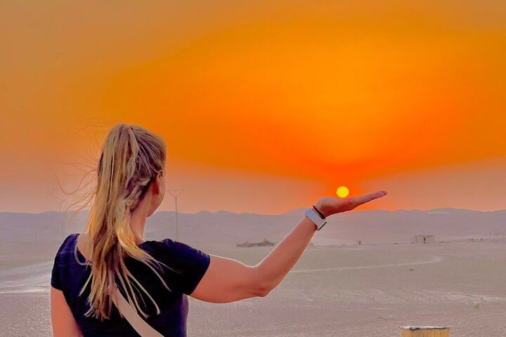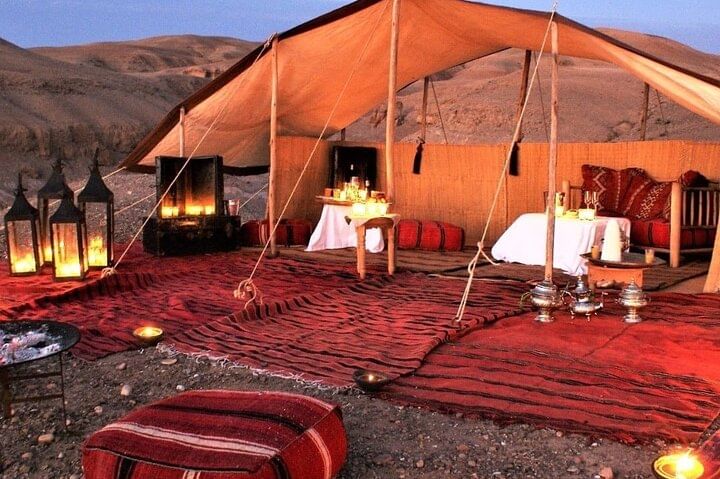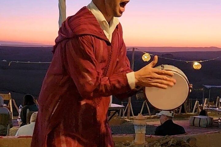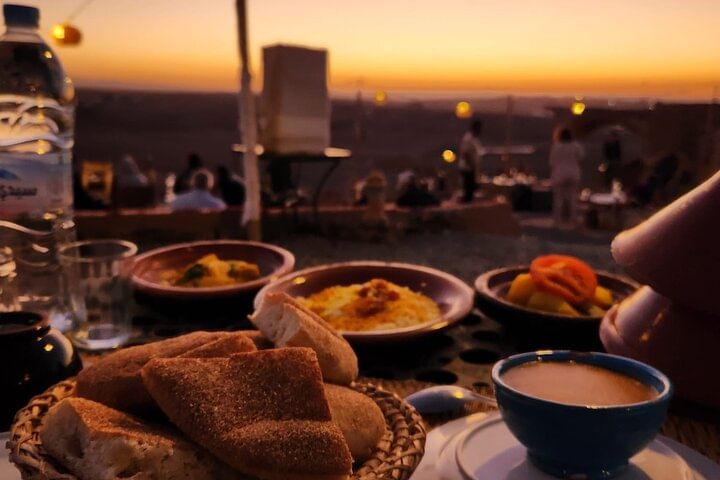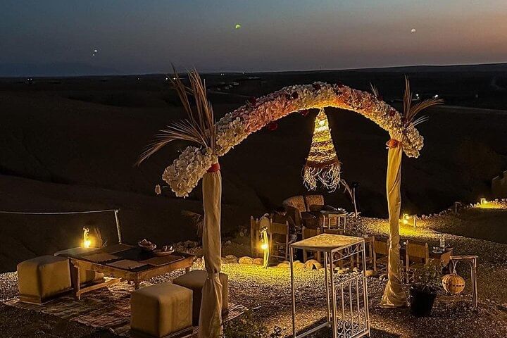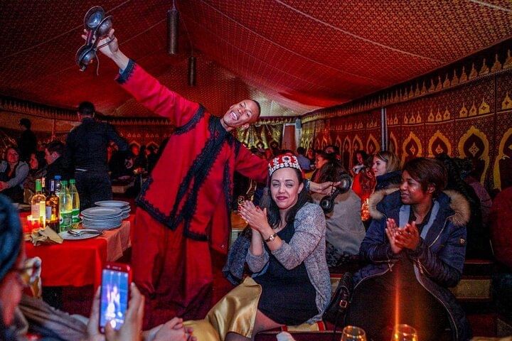 Sit down to a three-course dinner in the desert with this private dining package for couples, families, or groups. This tour includes round-trip transportation from your hotel or riad, a three-course dinner, and free bottled water. You'll have your choice of dining under the stars or in a protective tent